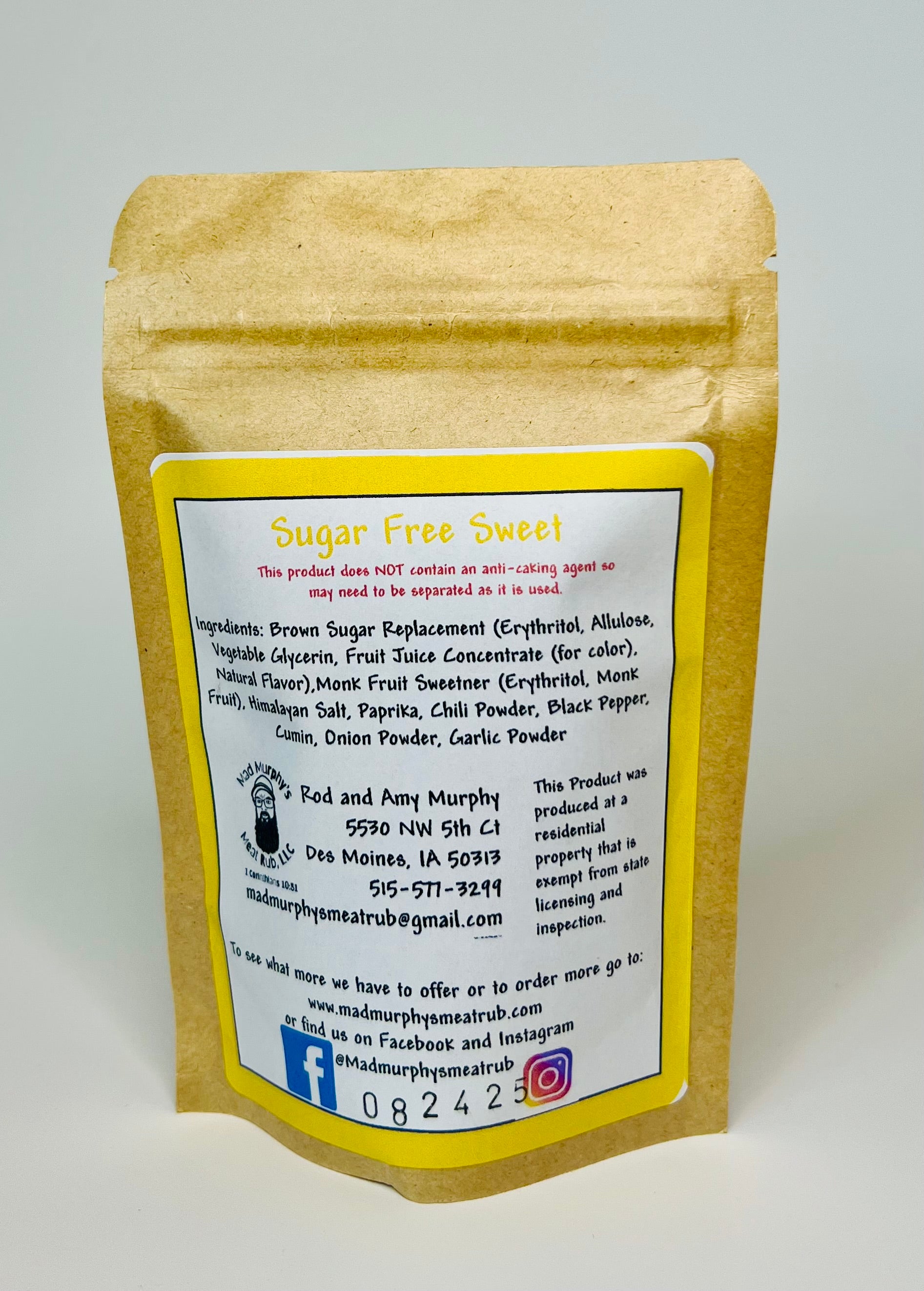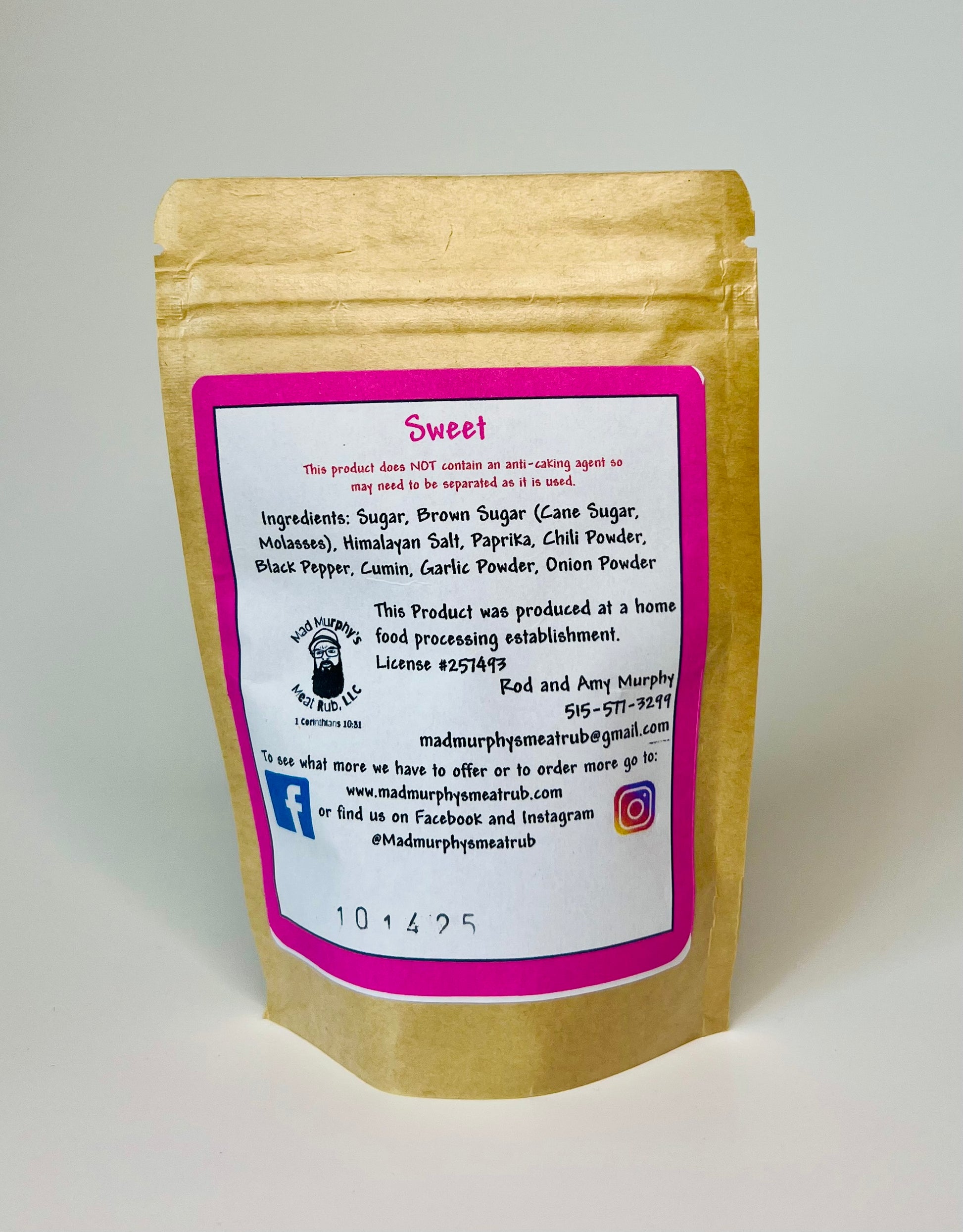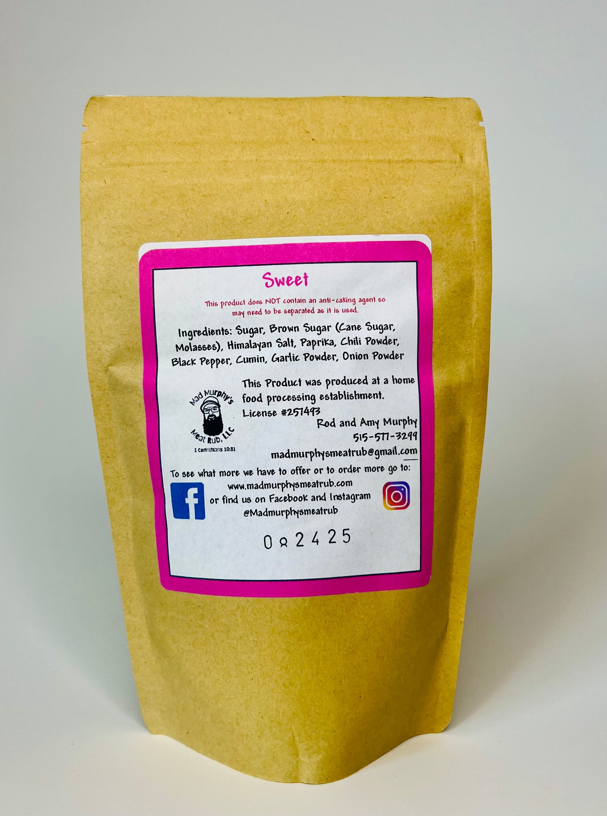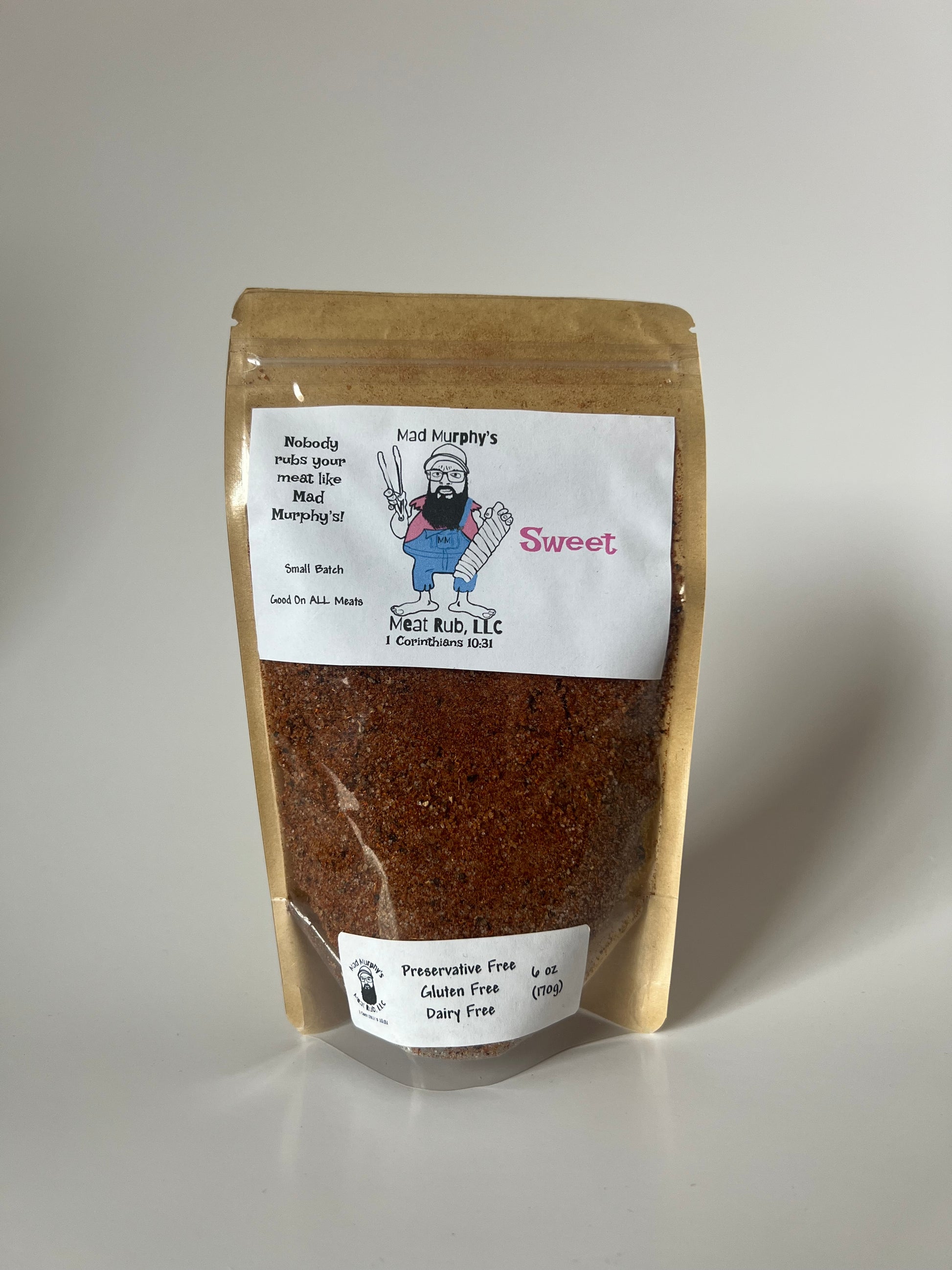 Sweet is a well rounded barbecue rub with no spice or kick to it. At a vendor show a one year old tried some on a piece of hamburger and came back for more and more. This is the most mild rub of the Mad Murphy collection and a hit among all ages. Great on all meats as well!